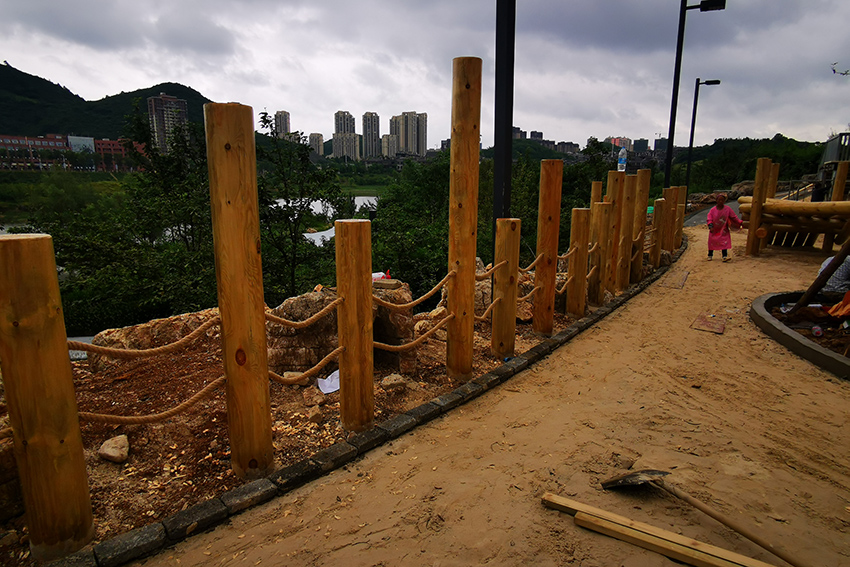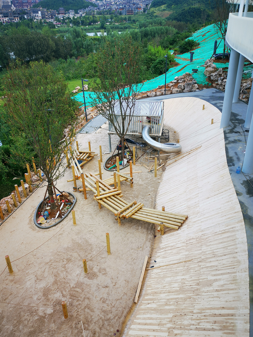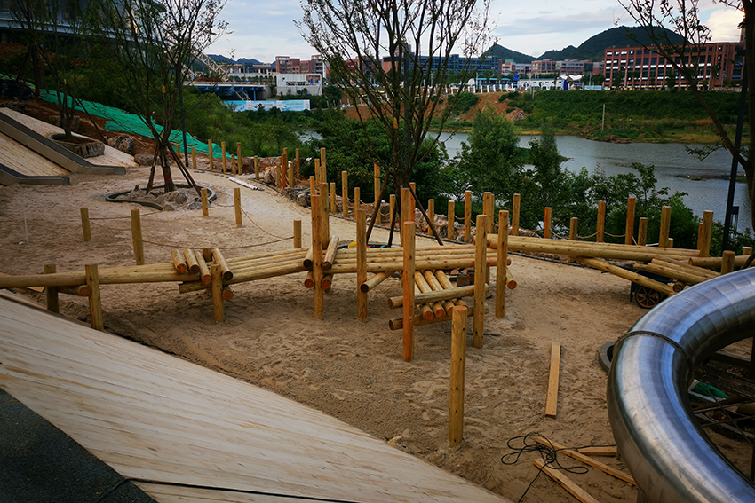 本次施工以不锈钢景观滑梯和木质平衡步道等元素为主,通过攀、爬,跑、跳等动作,锻炼平衡力及四肢协调能力。