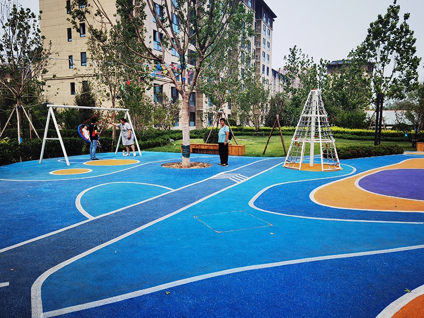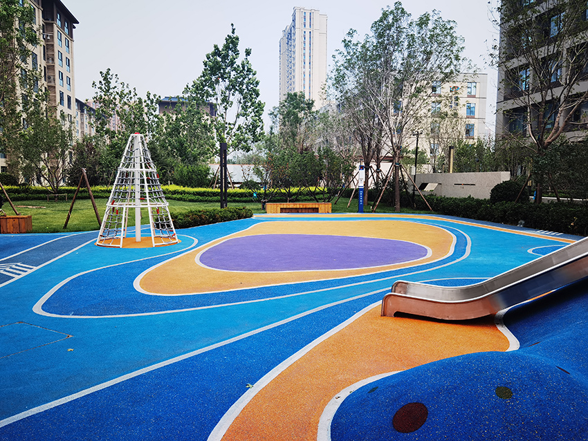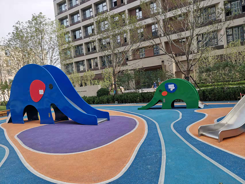 北京亦庄首创远洋禧瑞天著社区的主题乐园位于社区内的中心广场,广场采用橡胶地面,拥有微地形乐园,可以让孩子钻爬,也有滑滑梯,还有动物造型的小滑梯,秋千架,攀爬架等,可以让孩子们自有玩耍。